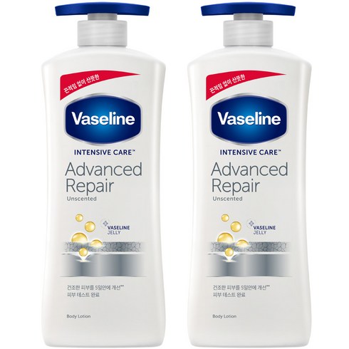 – 바세린 어드벤스드 리페어 로션은 400ml 용량으로 2개가 세트로 구성되어 있어요.